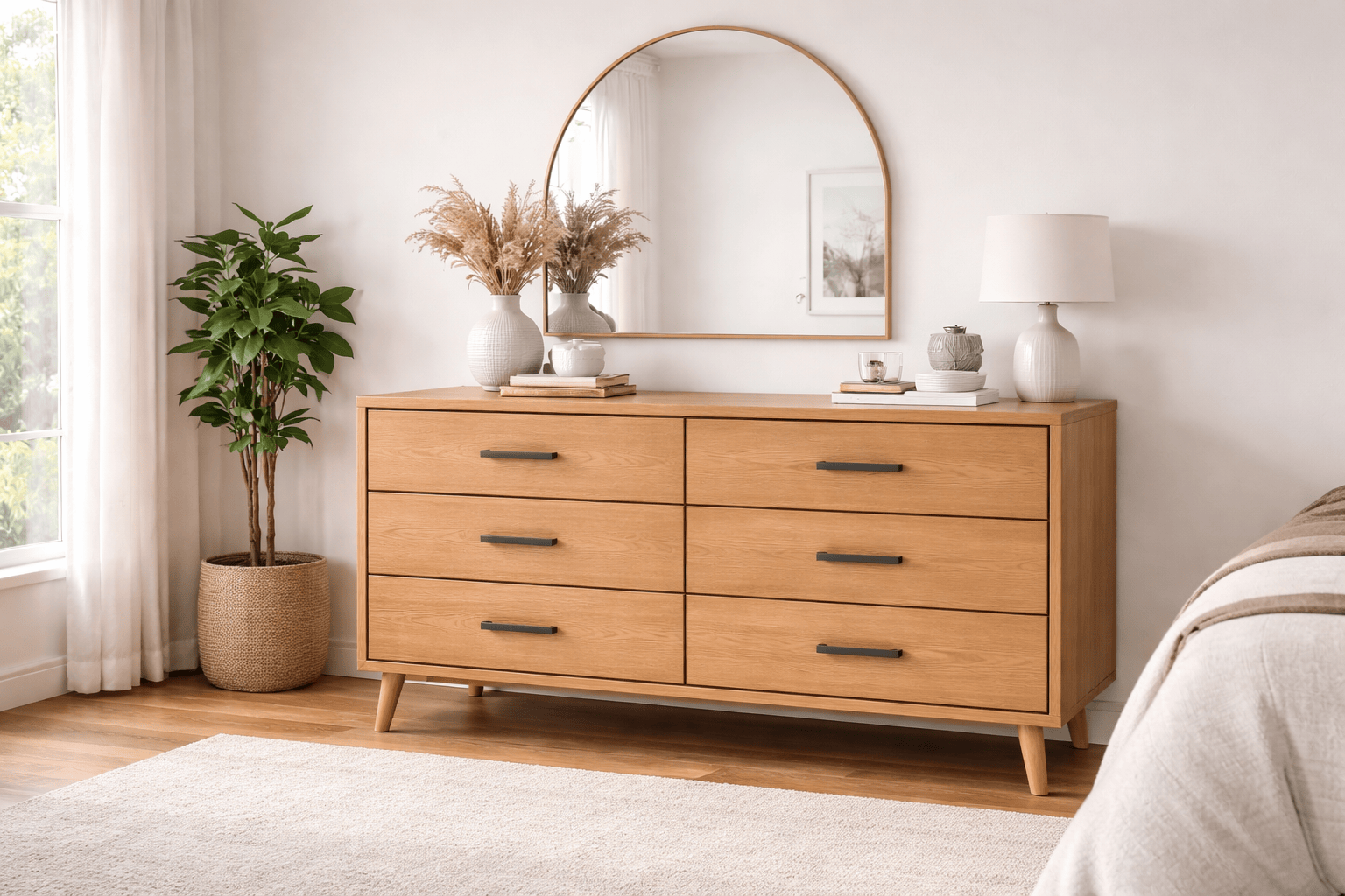 A functional dresser made for everyday use. Crafted from solid oak with six spacious drawers and sturdy steel handles. A simple and reliable storage option for the home.