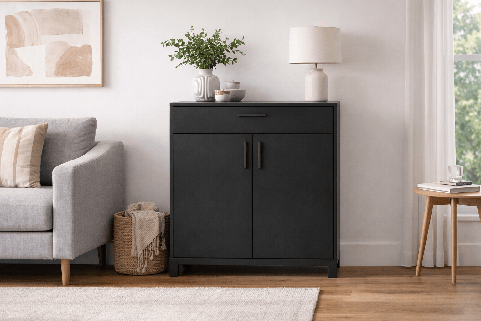 A simple storage cabinet suitable for everyday home use. Made from MDF and designed with one drawer and a two-door compartment. Compact size for easy placement in small or shared spaces.